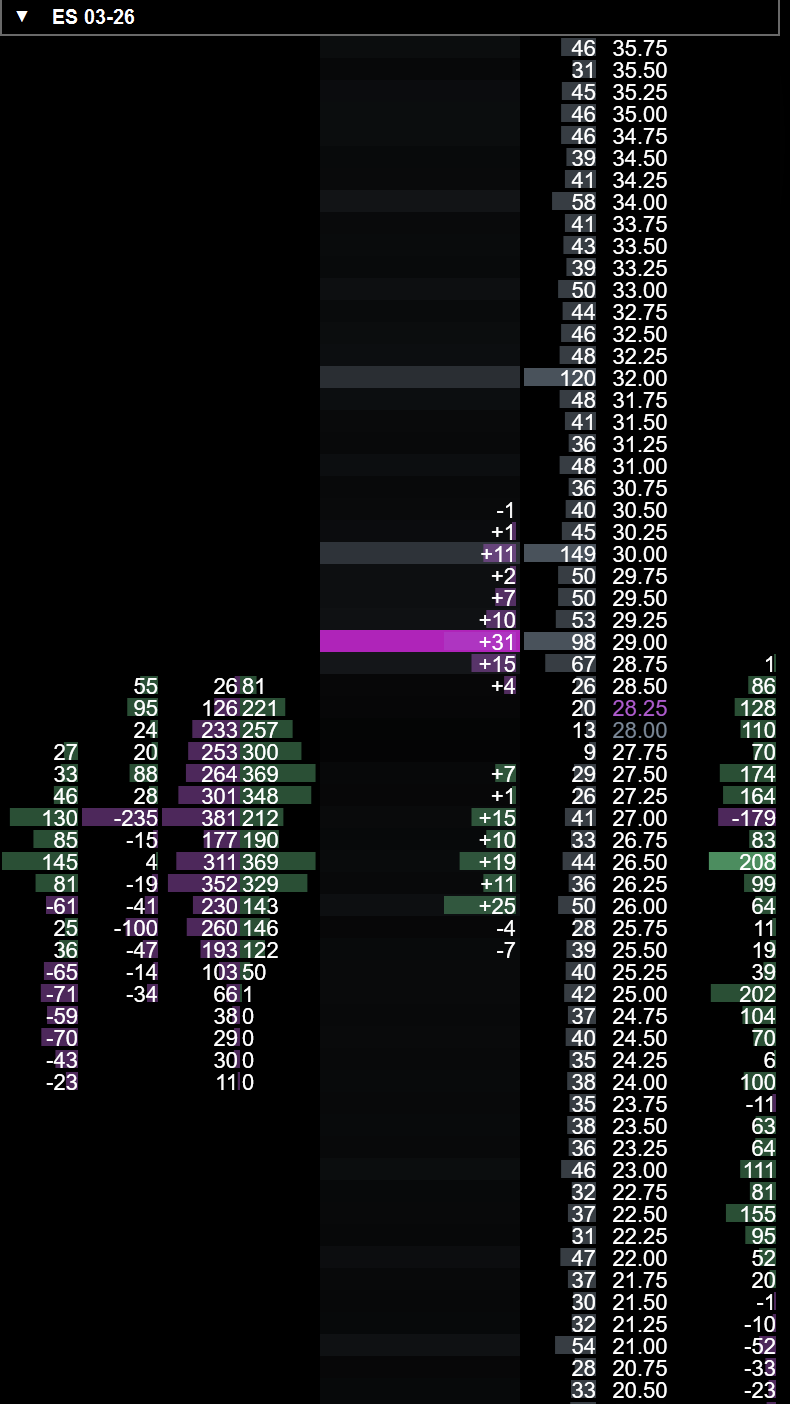 Presents a traditional order book view enhanced with advanced features, including a multi-visual pull stack and a delta meter that tracks developing buy/sell pressure on the current bar. Volume-based filtering highlights meaningful size, providing a clear, real-time picture of both market depth and evolving order flow.