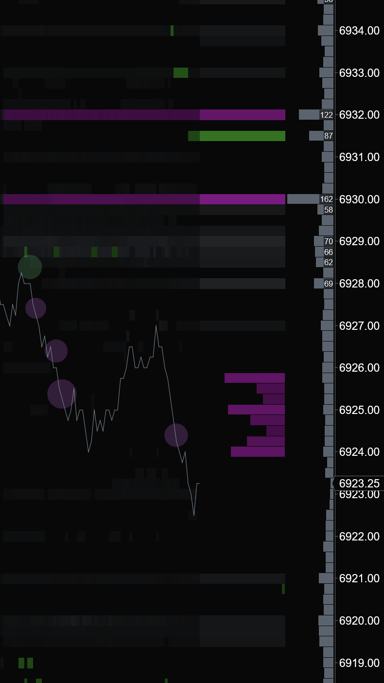 features an orderbook heatmap with granular control over every visual layer. Five independent tiers — each with its own color, min/max opacity, and threshold — let traders define exactly how depth is displayed, while log scaling prevents large resting orders from washing out the smaller shifts that matter. A pullstack overlay tracks where liquidity is being added or removed from the book, and a built-in Delta Tracker plots scaled bubbles wherever significant aggressive activity is detected. Three layers in one overlay: where liquidity is sitting, where it’s moving, and where aggression is hitting.