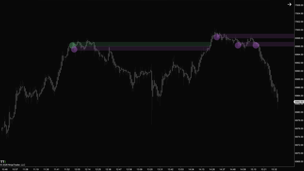 Automatically identifies swing highs and lows based on rotations in the market. Once a pivot is confirmed, a horizontal line is drawn across the chart, creating a running map of intraday turning points. These dynamic levels serve as valuable references for framing price action against prior swings.